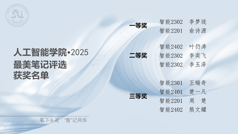 经个人投稿、学院综合评审等流程,人工智能学院2025年度最美笔记评选活动已完美收官。经过层层选拔,学院共评选出9份最美笔记,一起欣赏一下他们的笔下风采: